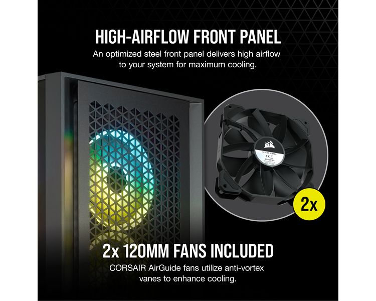Incluye dos ventiladores CORSAIR AirGuide de 120 mm, con aspas antirremolinos que concentran el flujo de aire y mejoran la refrigeración.